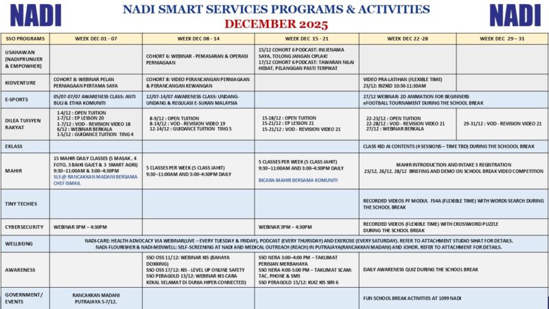 TARIKH AKTIVITI 01-12-2025 Mahir Jahit Intake 2 02-12-2025 Mahir Masak Intake 2 04-12-2025 Webinar Cybersecurity – Ancaman Kamera Tersembunyi 08-12-2025 Mahir Jahit Intake 2 09-12-2025 Mahir Masak Intake 2 15-12-2025 Mahir Jahit Intake 2 16-12-2025 Mahir Masak Intake 2 25-12-2025 […]